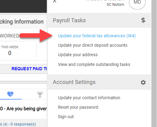 Your federal income tax allowances (Form W-4) can be updated through your WorkforceHub Employee Portal. If you were originally onboarded through WorkforceHub, you will find the process similar to how you filled out the form there. The link to update your W4 is found under the Payroll Tasks section of your profile menu.