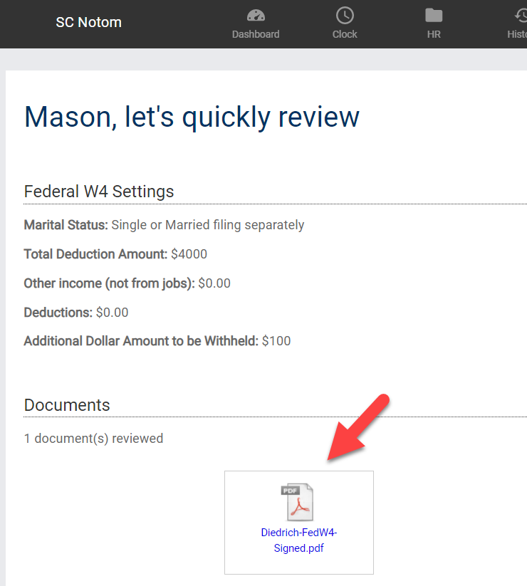 The second stage of the update process contains a summary of your W4 settings. You can also download a filled-in copy of your Form W-4 with the pdf link in the center of the page.
