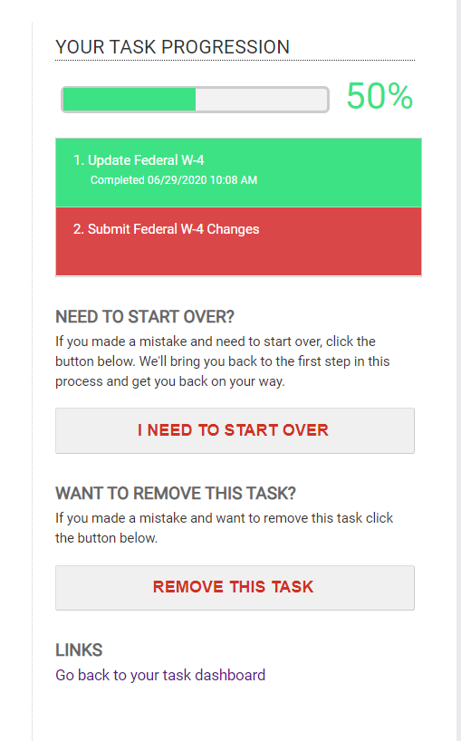 Once you start this process by selecting Update your federal tax allowances from your WorkforceHub profile menu, it's added as a Task within your HR tab. It remains as a task until you complete both stages of the update. However, if you decide you do not want to update your W4 and wish to remove the task entirely, just click REMOVE THIS TASK, found on the right-side of the update page. If you simply want to return to the first page and make some changes to your withholding form, click I NEED TO START OVER.