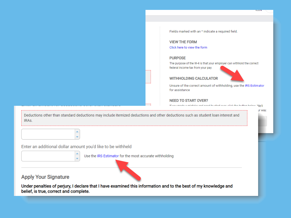 Updating your W4 is split into two stages. In the first stage, you fill out the form and apply your electronic signature. If you need help determining the correct amount of withholding, there are links to the IRS Estimator on the right-side and bottom of the page.